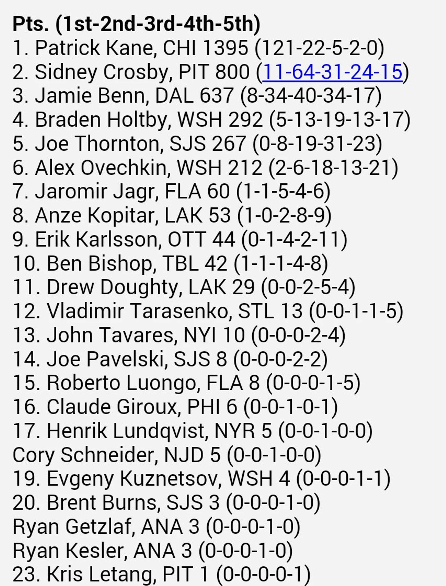 Ставший в итоге обладателем трофея форвард «Чикаго» Патрик Кэйн оторвался от занявшего второе место Сидни Кросби из «Питтсбурга» более, чем на 500 очков – 1395 баллов против 800. Капитан «Далласа» Джейми Бенн стал третьим с 637 баллами.