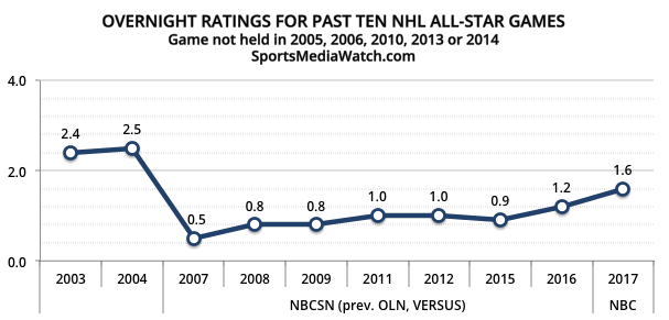 При этом Матч звезд НХЛ проиграл по рейтингу турниру по гольфу Farmers Insurance Open (рейтинг – 2,1, телеканал CBS), матчу НБА «Кливленд» – «Оклахома» (2,5, канал ABC) и Пробоулу – Матчу звезд НФЛ (4,6, ESPN).