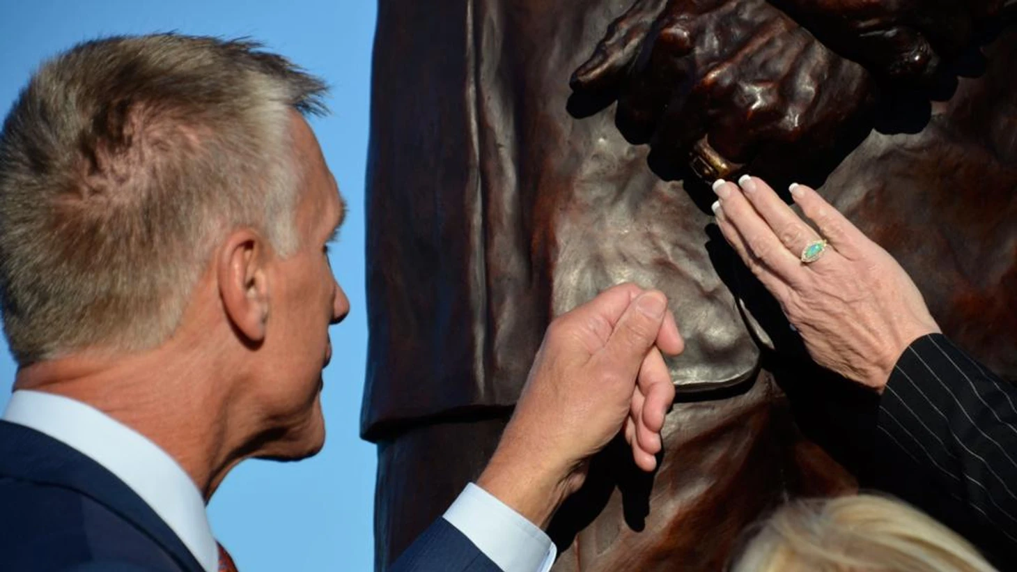 Бронзовая скульптура высотой почти 2,8 метра установлена рядом с ареной «Уэллс Фарго Центр».