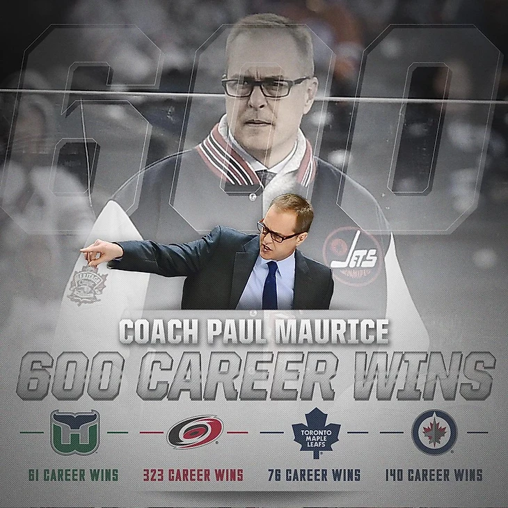 Сегодняшняя победа «Виннипега» над «Миннесотой» (4:3) в регулярном чемпионате НХЛ стала 600-й для главного тренера «Джетс» Пола Мориса.