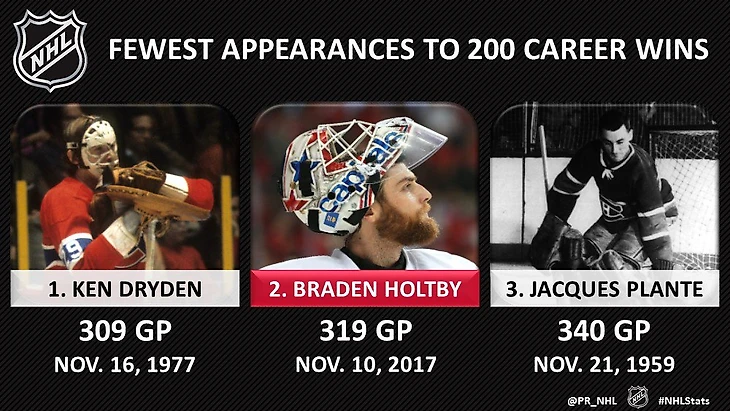 НХЛ. Холтби одержал 200 побед в лиге за 319 матчей. Меньше для этого понадобилось только Драйдену