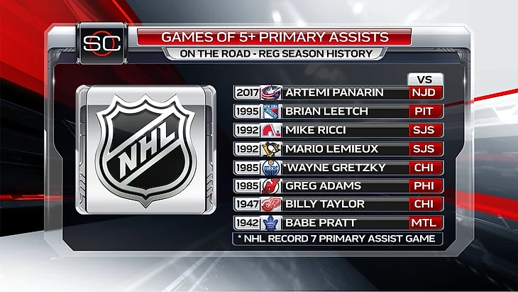 НХЛ. Панарин стал 8-м игроком в истории, сделавшим 5 первых передач в выездном матче. Присоединился к Гретцки и Лемье