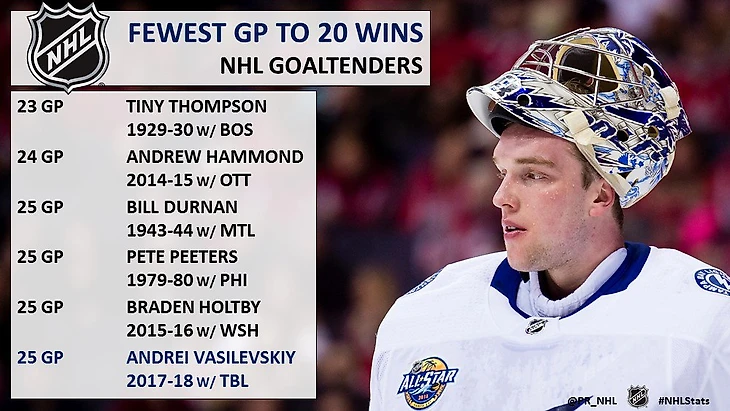 До Василевского в истории лиги было всего 5 вратарей, кто одержал 20 побед в сезоне, затратив 25 матчей или меньше.