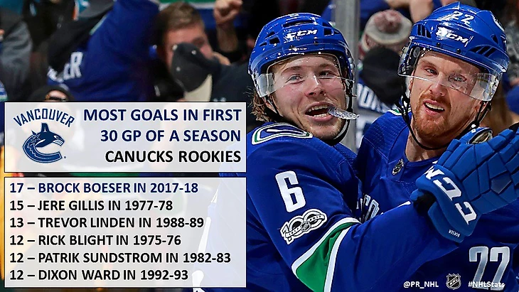 НХЛ. Босер забил 17 голов в первых 30 матчах сезона. Это лучший результат для новичка в истории «Ванкувера»