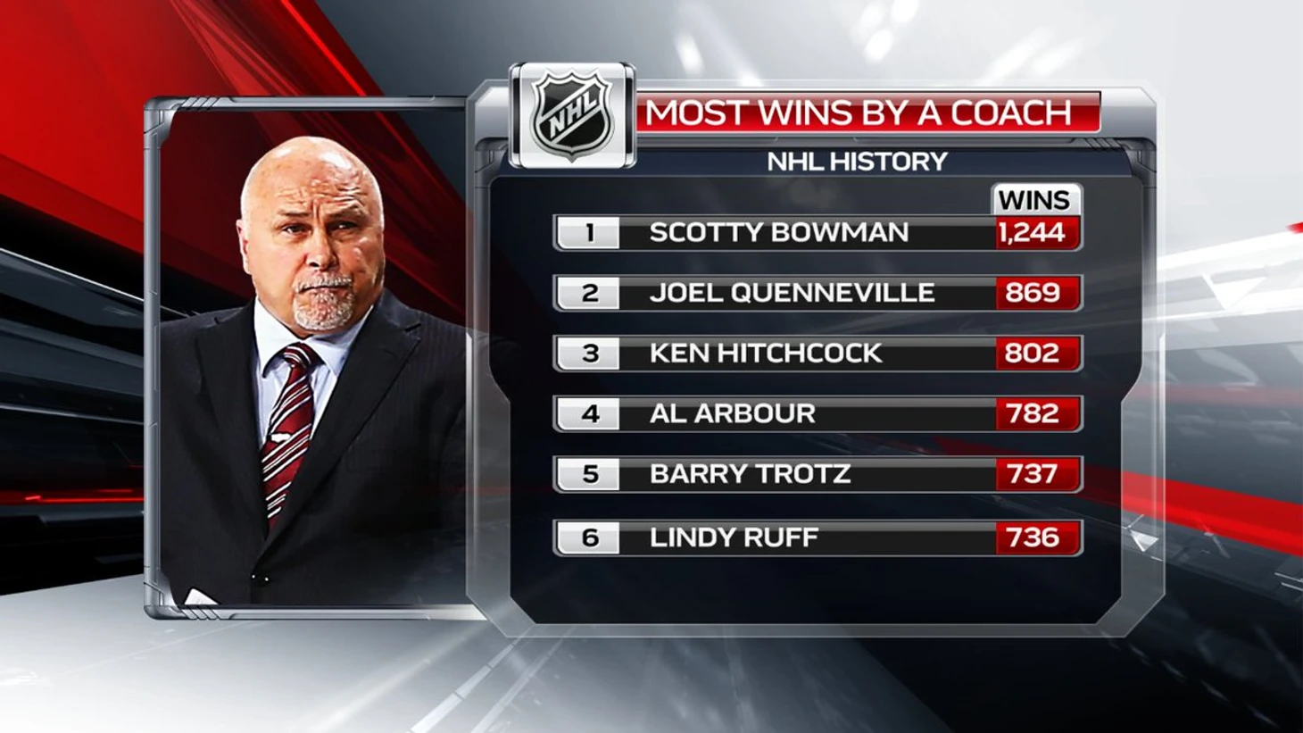 Рекордсмен среди тренеров – Скотти Боумэн (1244 победы). В топ-4 также входят Джоэл Кенневилл (869), Кен Хичкок (802) и Эл Арбур (782).