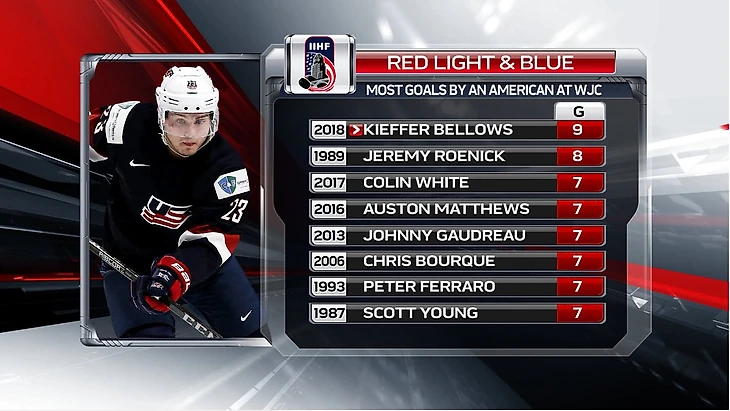 Форвард молодежной сборной США Киффер Беллоуз стал лучшим снайпером МЧМ-2018 с девятью заброшенными шайбами.