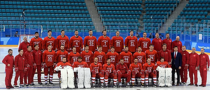 Российские хоккеисты приняли участие в командной фотосессии на олимпийской арене