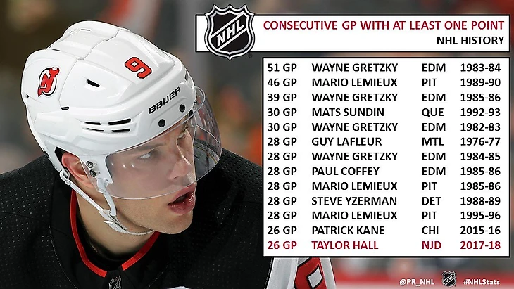 Форвард «Нью-Джерси» Тэйлор Холл сделал 2 голевые передачи в матче с «Монреалем» (6:4) и довел личную результативную серию до 26 матчей.
