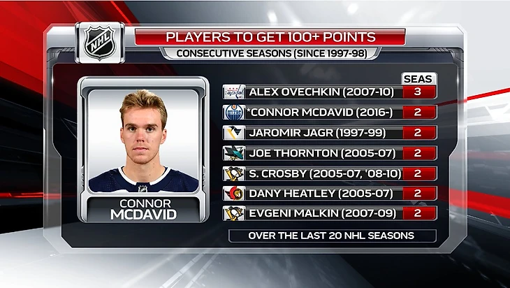 Он достиг отметки 100 очков во втором сезоне подряд, став 7-м игроком за последние 20 лет, кому это удавалось. В последний раз до него такое достижение было у Александра Овечкина (в общей сложности три сезона) и Сидни Кросби в 2010 году.