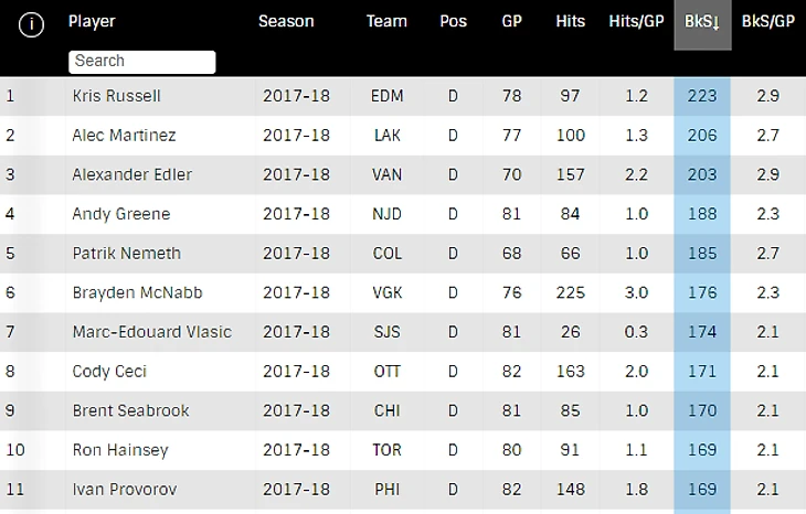 Лучшим игроком лиги по данному показателю стал защитник «Эдмонтона» Крис Рассел. На его счету 223 заблокированных броска.