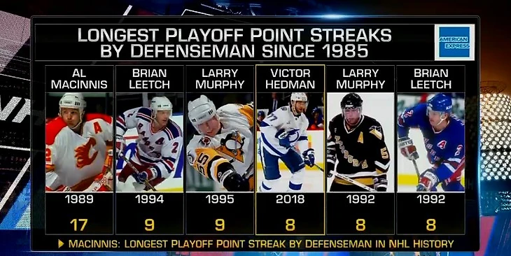 Это первый такой случай для защитника, начиная с 1995 года, когда Ларри Мерфи из «Питтсбурга» выдал 9-матчевую результативную серию.