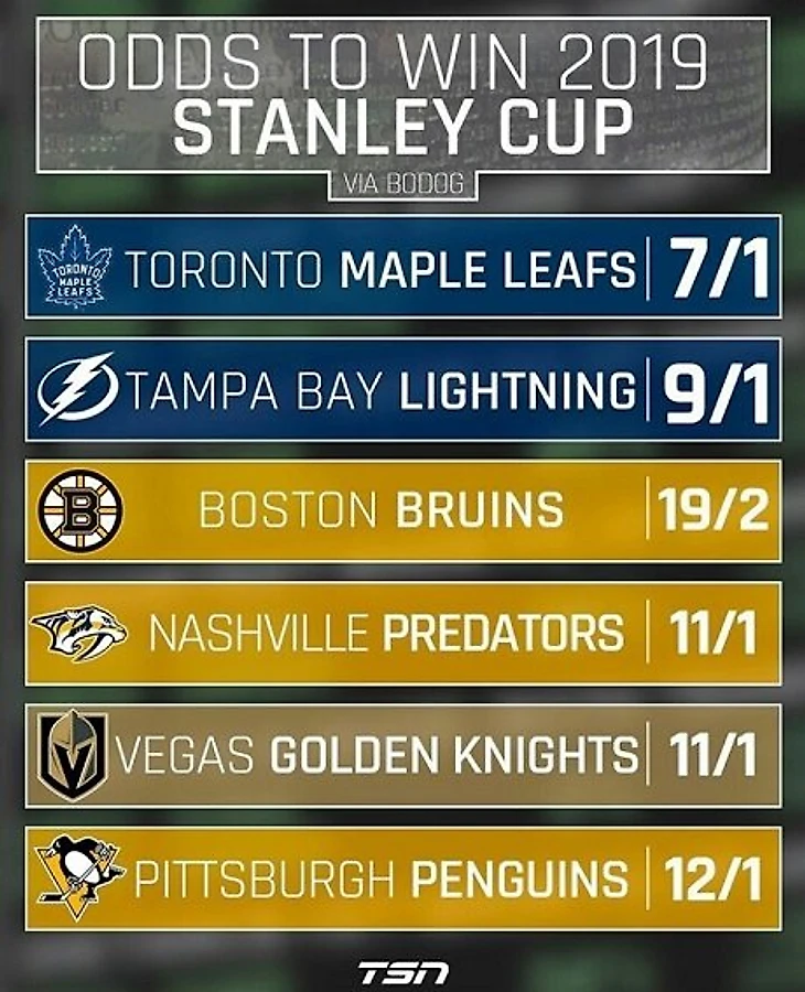На победу «Мэйпл Лифс» дают коэффициент 7 к 1. В тройку входят «Тампа-Бэй» (9 к 1) и «Бостон» (19 к 2).