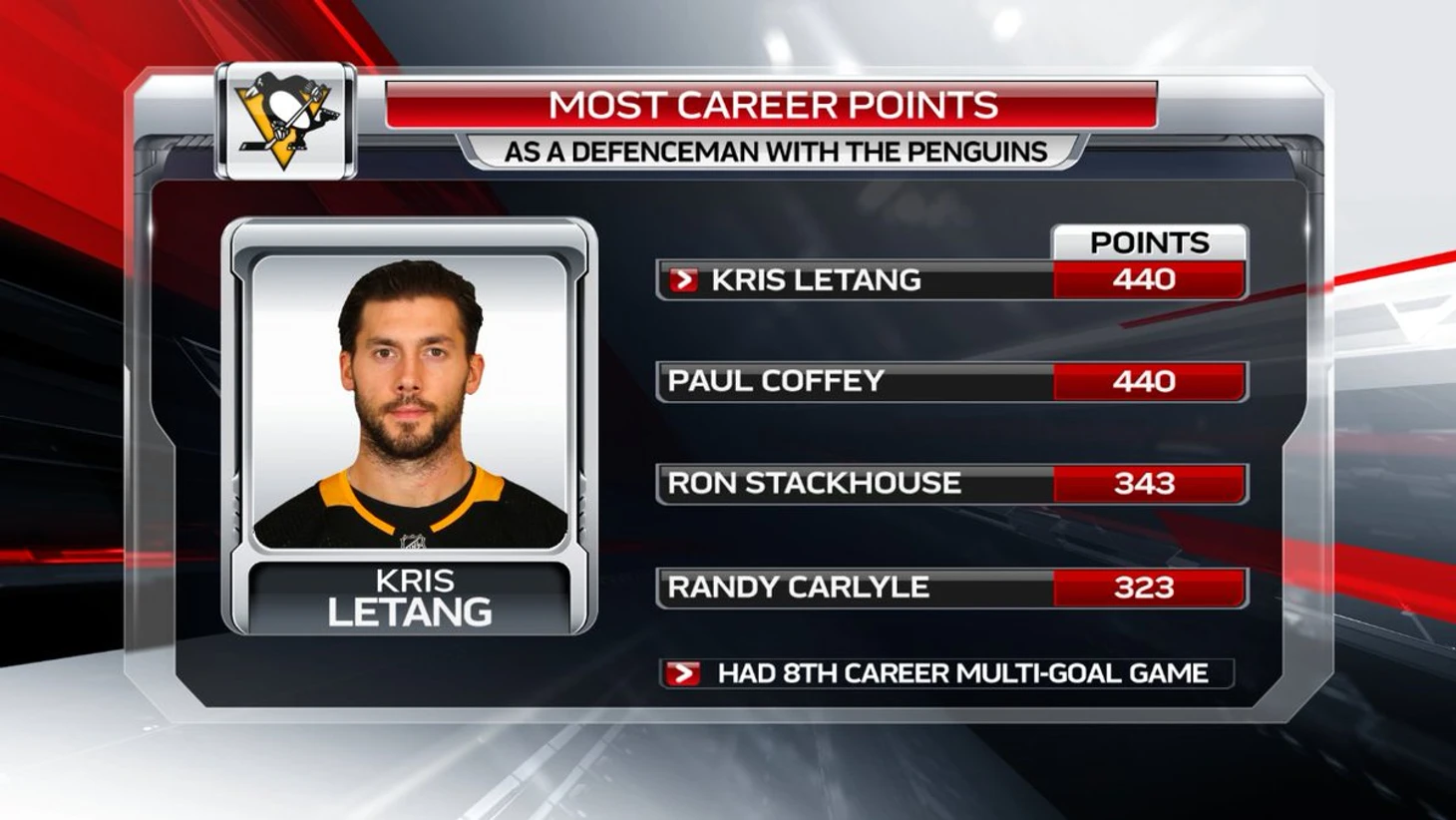 Защитник «Питтсбурга» Крис Летанг набрал 3 (2+1) очка в матче с «Вашингтоном» (7:6 ОТ).