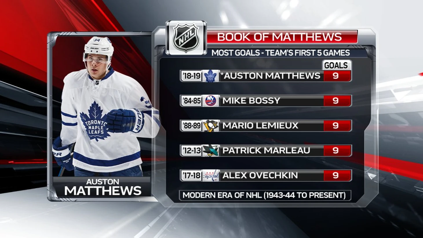 НХЛ. Мэттьюс – 5-й игрок за 75 лет, забивший 9 голов в 5 стартовых матчах. После Босси, Лемье, Марло и Овечкина