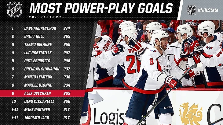 НХЛ. Овечкин забил 233-й гол в большинстве за карьеру и вышел на 9-е место в истории, обойдя Сиссарелли