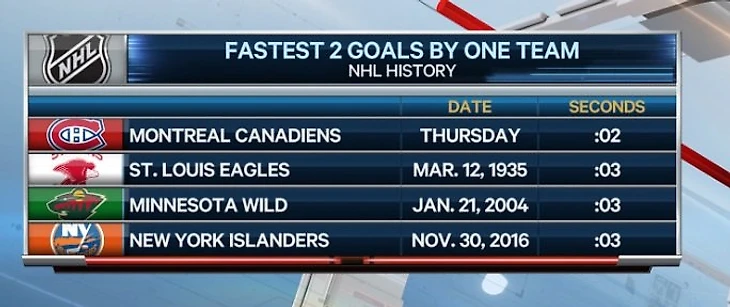 «Монреаль» установил рекорд НХЛ по скорострельности, забросив 2 шайбы в ворота «Вашингтона» (6:4) с интервалом в 2 секунды.