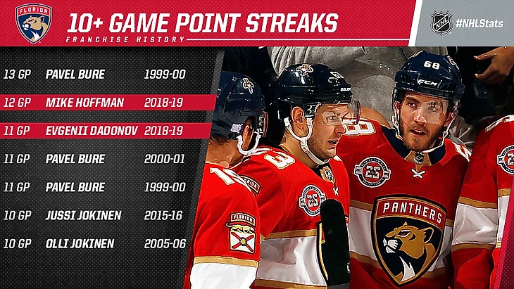 Таким образом, серия Дадонова составляет 11 матчей, Хоффмана — 12 матчей. Они приблизились к рекордсмену «Пантерс» по продолжительности результативной серии Павлу Буре – 13 матчей в сезоне-1999/2000.
