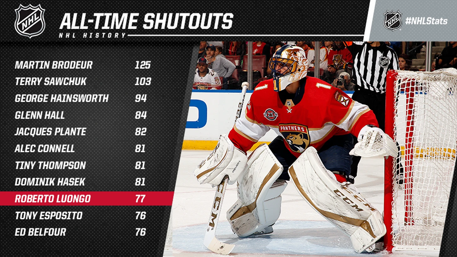 Таким образом, Луонго вышел на единоличное 9-е место по этому показателю в истории, обойдя Тони Эспозито и Эда Белфора, на счету которых по 76 матчей на ноль.
