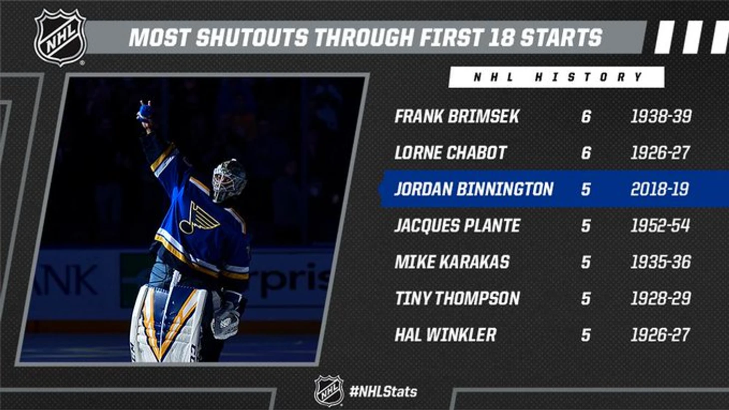 Кроме того, Биннингтон – первый вратарь за 65 лет, сделавший 5 или более шатаутов в 18 первых матчах в лиге в качестве стартового вратаря.