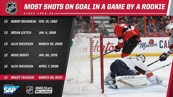 Форвард «Оттавы» Брэди Ткачак нанес 12 бросков в створ ворот в матче регулярного чемпионата НХЛ против «Флориды» (2:5).