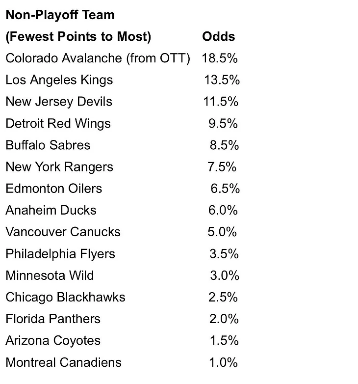 В нем примут участие все клубы, не попавшие в плей-офф в текущем сезоне, за исключением «Оттавы», чьи шансы достанутся «Колорадо». Вероятности по сравнению с прошлым годом не пересматривались.