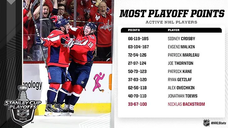 НХЛ. Бэкстрем – 9-й действующий игрок, набравший 100+ очков в плей-офф