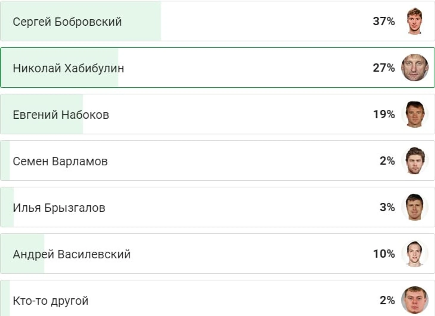 Бобровский получил 37% голосов. Второе место занял Николай Хабибулин (27%), третье – Евгений Набоков (19%).