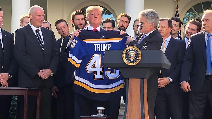 Владелец «Блюз» Том Стиллман подарил президенту клубную форму, также Трамп получил от «Сент-Луиса» клюшку с логотипом команды.