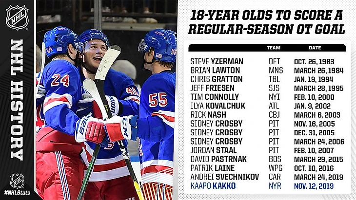 Кроме того, финский форвард стал 13-м игроков в истории лиги, забросившим шайбу в овертайме в регулярных чемпионатах НХЛ в возрасте 18 лет.
