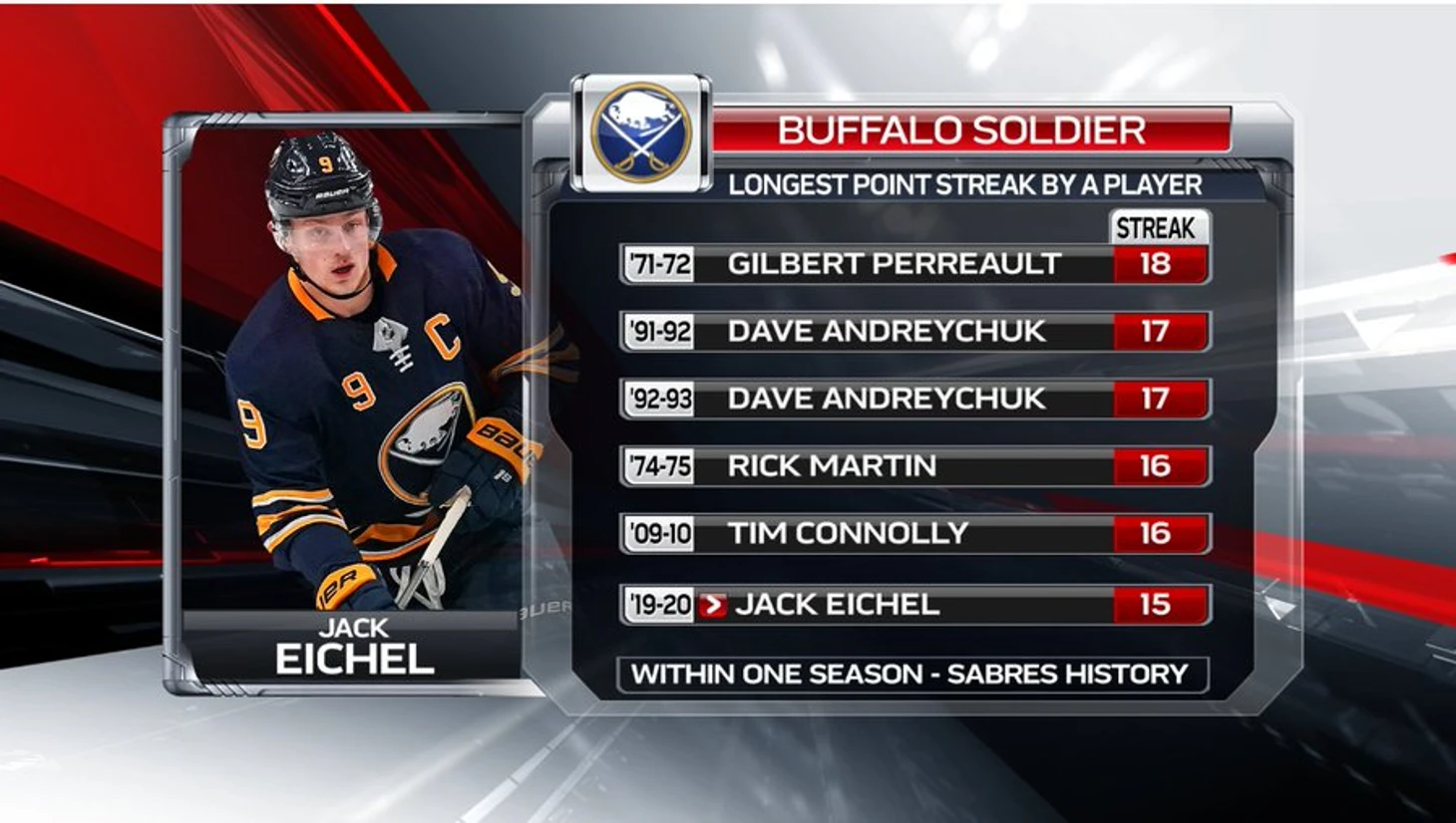 Рекорд «Баффало» принадлежит Жильберу Перро (18 матчей в сезоне-1971/72).
