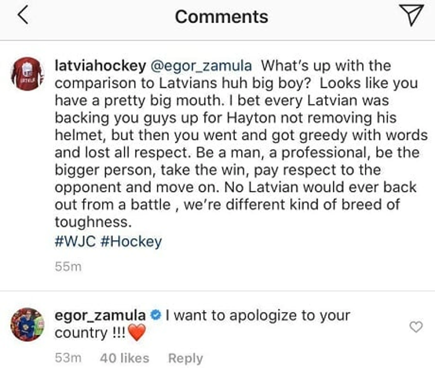 «Хочу извиниться перед вашей страной!!!», – написал Замула в инстаграме Федерации хоккея Латвии.