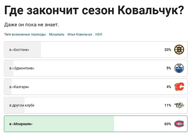5% проголосовавших считают, что хоккеист перейдет в «Эдмонтон». Еще 4% участников опроса отдали голоса за обмен в «Калгари».