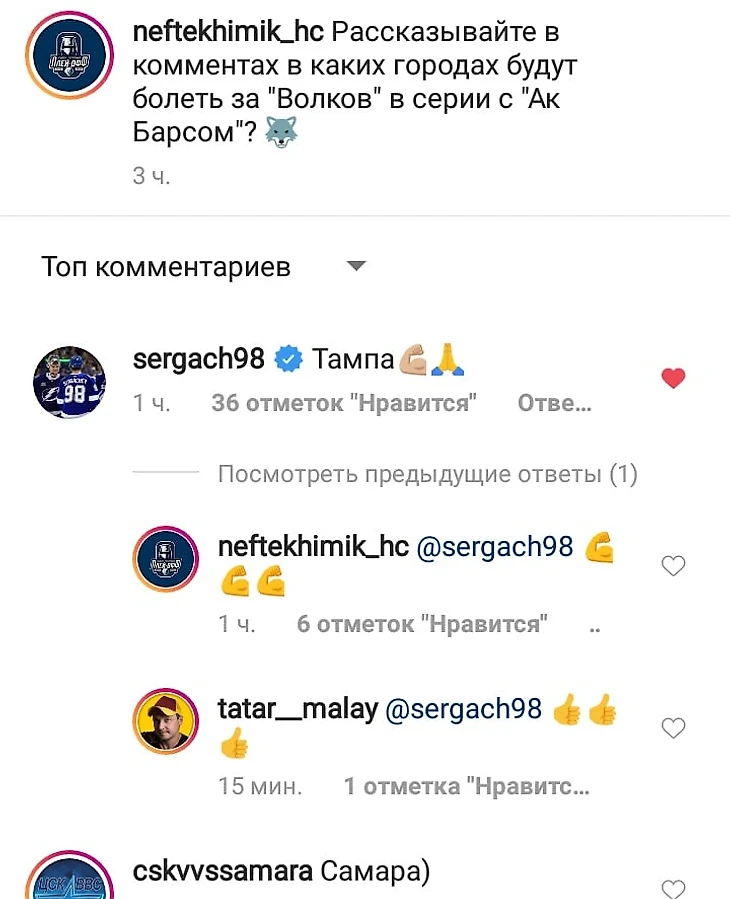 В инстаграме нижнекамский клуб спросил подписчиков о том, в каких городах будут болеть за команду. В комментариях ответил Сергачев и написал: «Тампа».