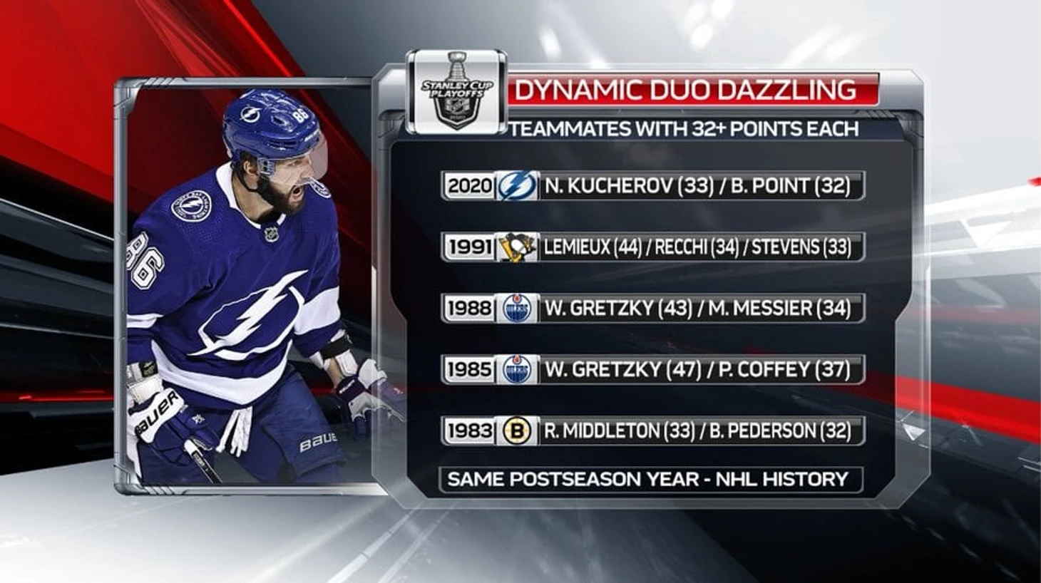 Кучеров и Пойнт стали пятым в истории дуэтом одноклубников, набравших по 32 или более очка в одном розыгрыше Кубка Стэнли.