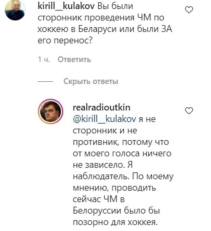По моему мнению, проводить сейчас ЧМ в Беларуси было бы позорно для хоккея», – написал Уткин в комментариях к посту в инстаграме.