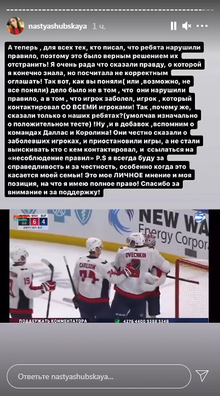 Анастасия Шубская, жена нападающего «Вашингтона» Александра Овечкина дополнила свой прошлый пост, посвященный отстранению российских игроков «столичных» из-за нарушения ковид-протоколов.