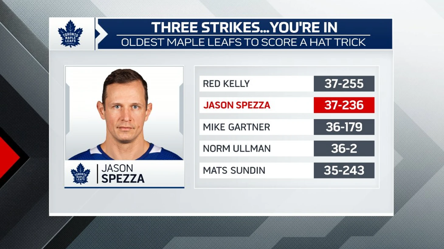 Канадец (37 лет 236 дней) стал 2-м в списке самых возрастных игроков «Торонто» с таким достижением. Старше был только член Зала славы Ред Келли (37 лет 255 дней).