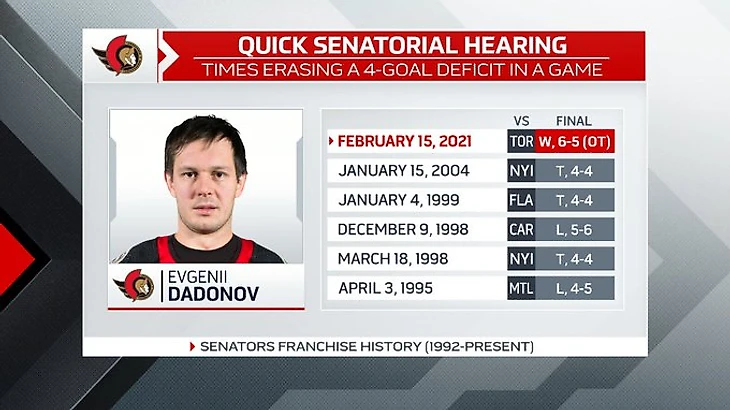 Для «Сенаторс» это 6-й случай в истории, когда в ходе матча им удалось отыграть дефицит в 4 гола. При этом в прошлых 5 таких матчах команда в итоге проигрывала, либо делала ничью.