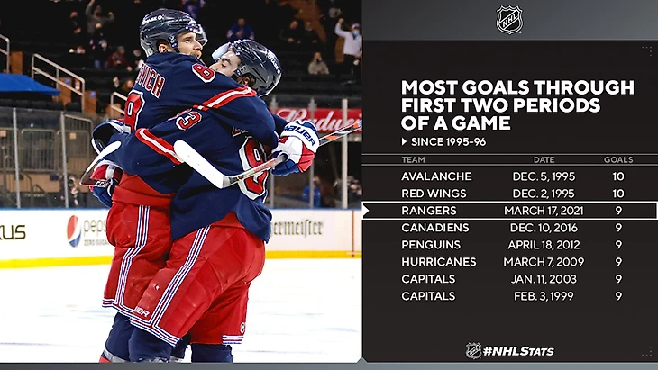 «Рейнджерс» – 8-й клуб НХЛ за 25 лет, забивший 9+ голов за первые два периода матча