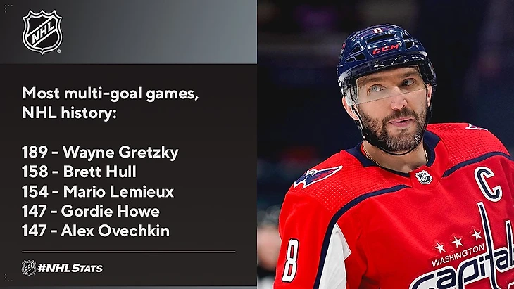 Овечкин в 147-й раз забил 2+ гола в матче НХЛ и разделил с Хоу 4-е место в истории. Выше только Гретцки, Бретт Халл и Лемье