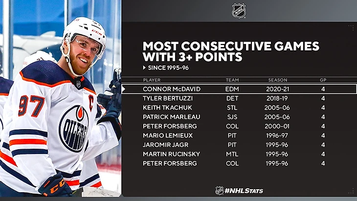 Макдэвид набрал 3+ очка в 4-м матче подряд. У него 84 балла в 47 играх