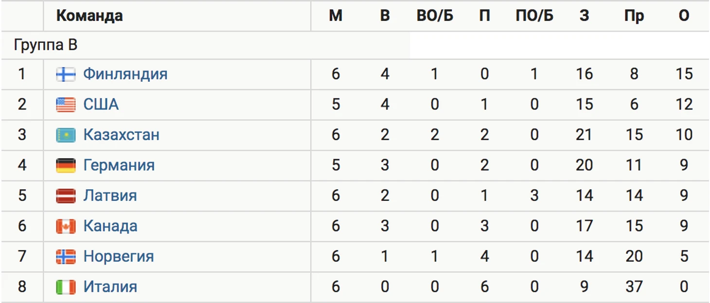 Финляндия, обыграв Латвию (3:2 ОТ), обеспечила себе место в 1/4 финала. Команда возглавляет группу B с 15 очками после шести игр.