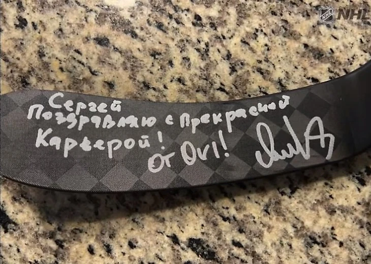 «Сергей, поздравляю с прекрасной карьерой! От Ови», – написал Овечкин на клюшке.