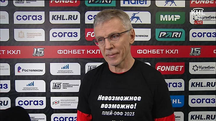 Главный тренер «Торпедо» пообщался с корреспондентом в такой футболке перед началом четвертого матча серии второго раунда Кубка Гагарина против СКА.