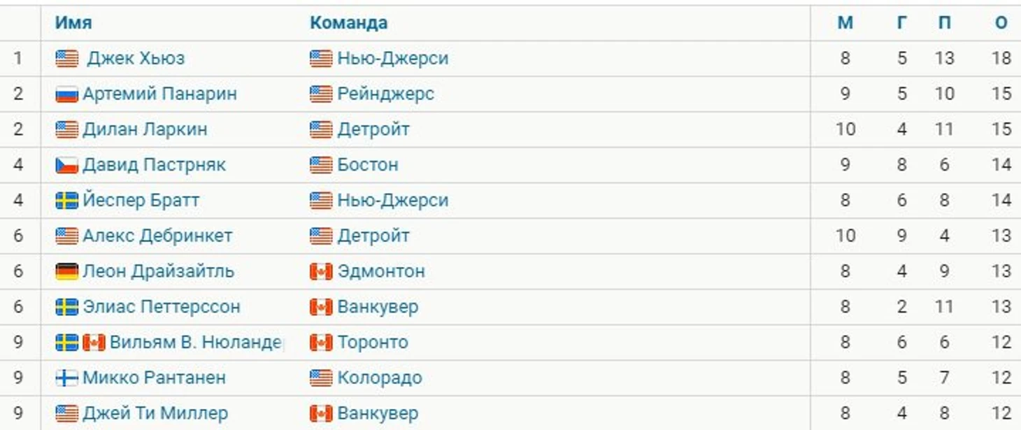 Лидирует в гонке бомбардиров лиги форвард «Нью-Джерси» Джек Хьюз с 18 (5+13) баллами в 8 играх.