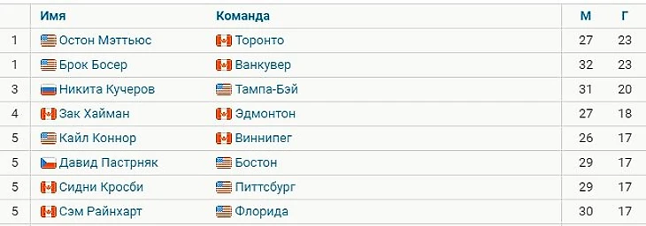 На третьем месте идет форвард «Тампы» Никита Кучеров (20 шайб в 31 игре), на четвертом – форвард «Эдмонтона» Зак Хайман (18 шайб в 27 играх).