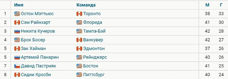 На третьем месте идет форвард «Тампы» Никита Кучеров с 28 шайбами в 42 играх, на четвертом – форвард «Ванкувера» Брок Босер (27 в 42, сегодня – дубль в ворота «Питтсбурга»).
