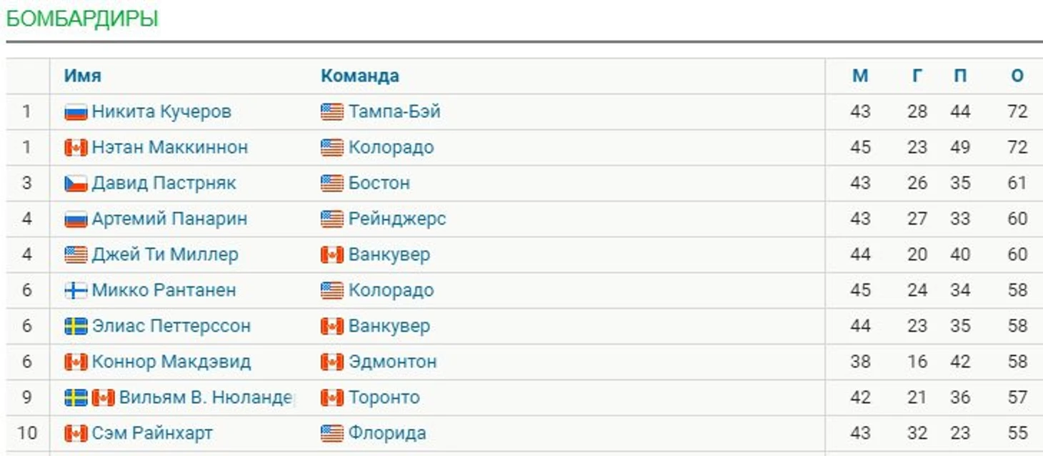 Маккиннон догнал Кучерова в гонке бомбардиров НХЛ, у обоих лидеров по 72 очка. Канадец провел 45 игр, россиянин – 43