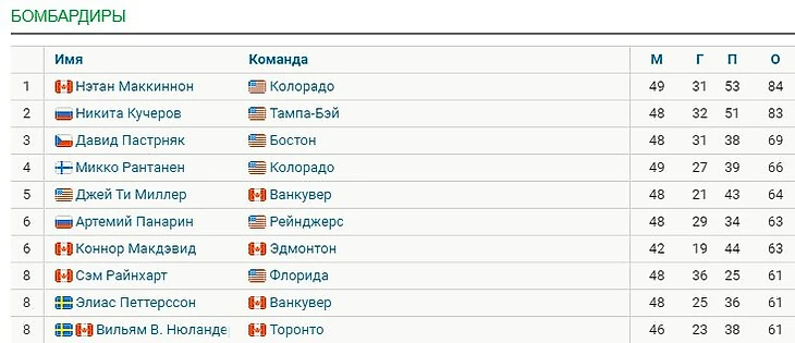Канадец вернул лидерство в гонке бомбардиров лиги, обогнав Никиту Кучерова из «Тампы» (83 очка в 48 играх, 32+51). На третьем месте идет Давид Пастрняк из «Бостона» (69 очков в 48 играх, 31+38).