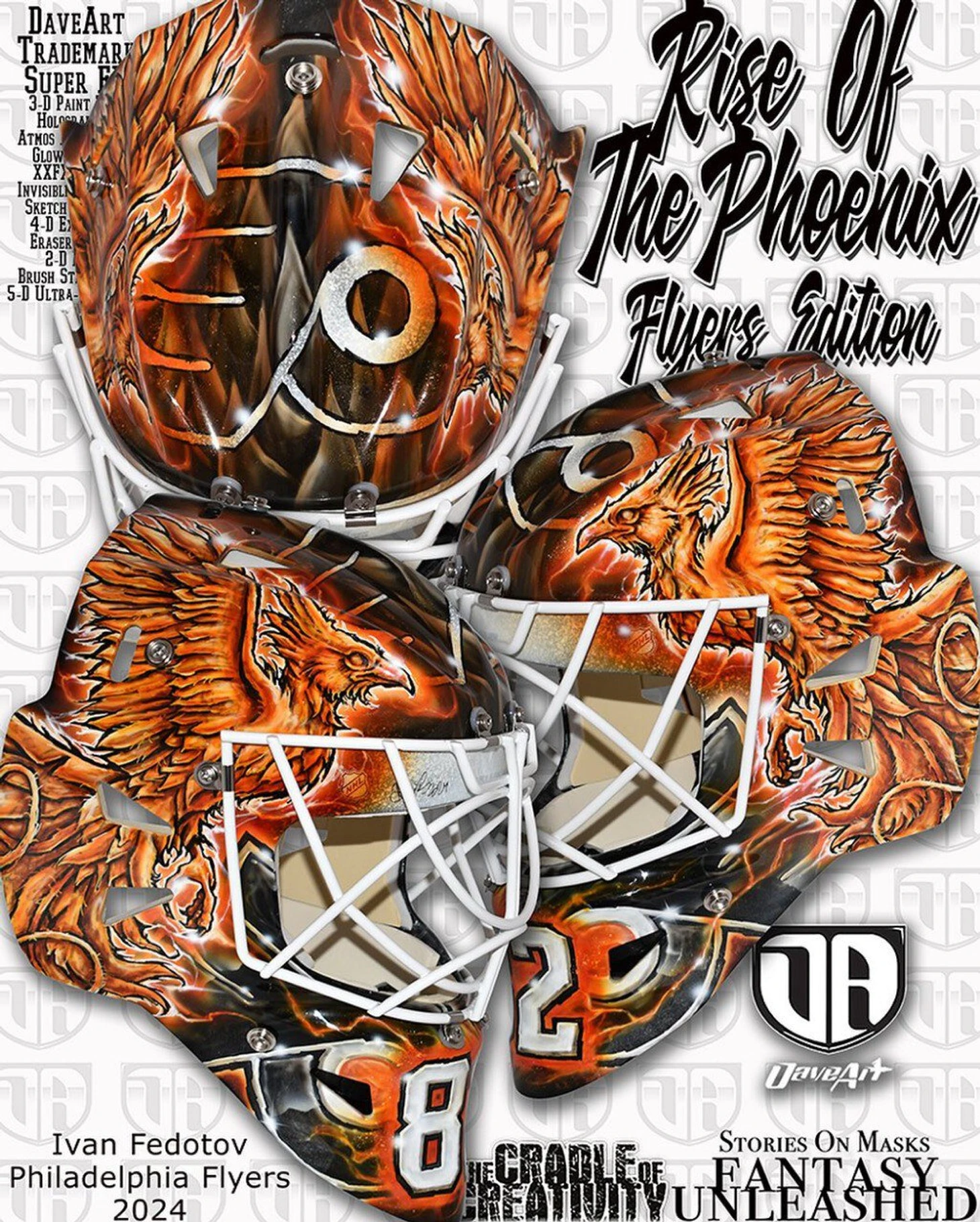 Художник Давид Гуннарссон показал дизайн, который он разработал для новой маски российского вратаря «Филадельфии». На ней изображена мифологическая птица феникс, возрождающаяся из пепла.